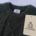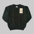 This is a cozy dark green knitted sweater featuring a classic cable knit pattern on the front. The sweater has a round neckline and ribbed cuffs and hem, providing a snug and comfortable fit. Its solid color and traditional design make it a versatile piece perfect for chilly weather, offering warmth with a timeless style.